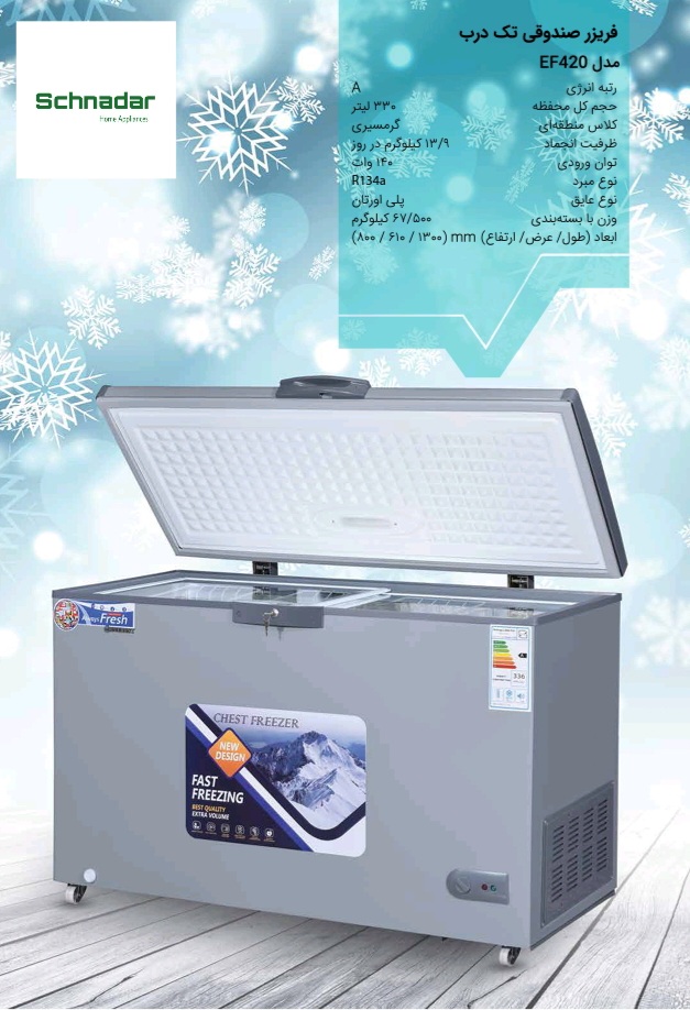 فریزر صندوقی تک درب اشنایدر مدل EF420، یک انتخاب هوشمندانه برای افرادی است که به دنبال کیفیت و طراحی منحصربهفرد هستند. این محصول با حفظ ویژگیهای پیشرفته و عملکرد عالی، راهکاری اقتصادی و مؤثر برای نگهداری مواد غذایی فراهم میکند.